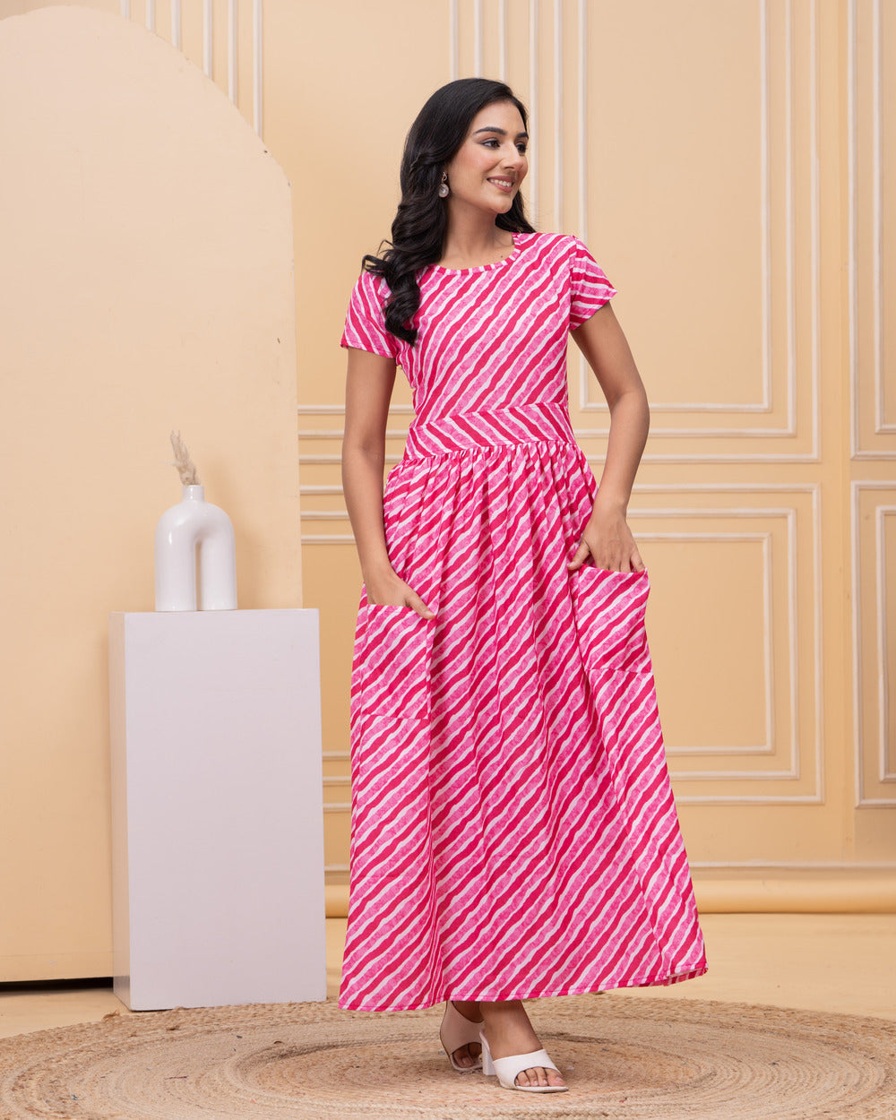 pink cotton dress, striped maxi dress, women's summer outfit, casual day dress, fit and flare dress, Indian fashion, breathable cotton wear, stylish maxi for women, ethnic western fusion, modern feminine look